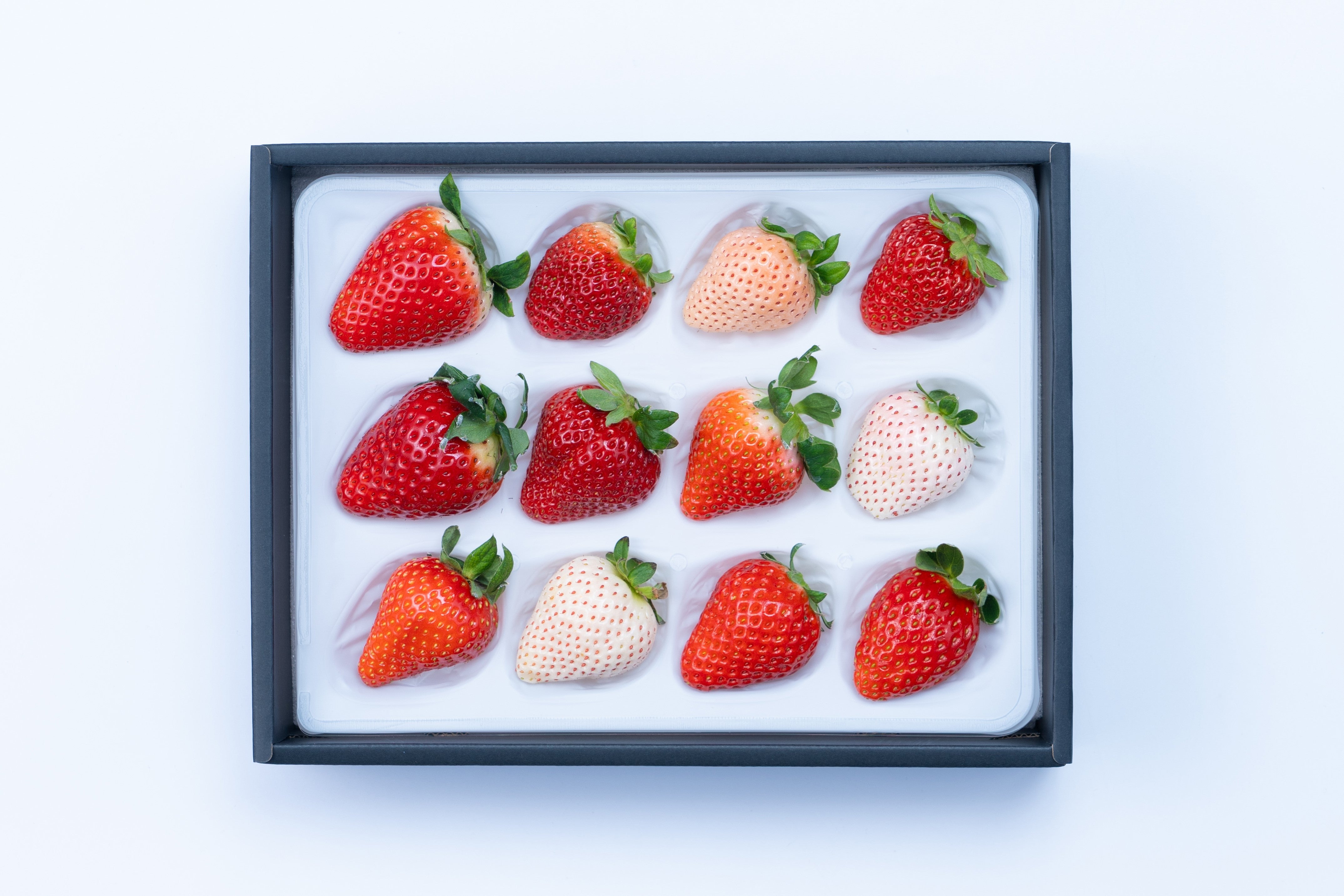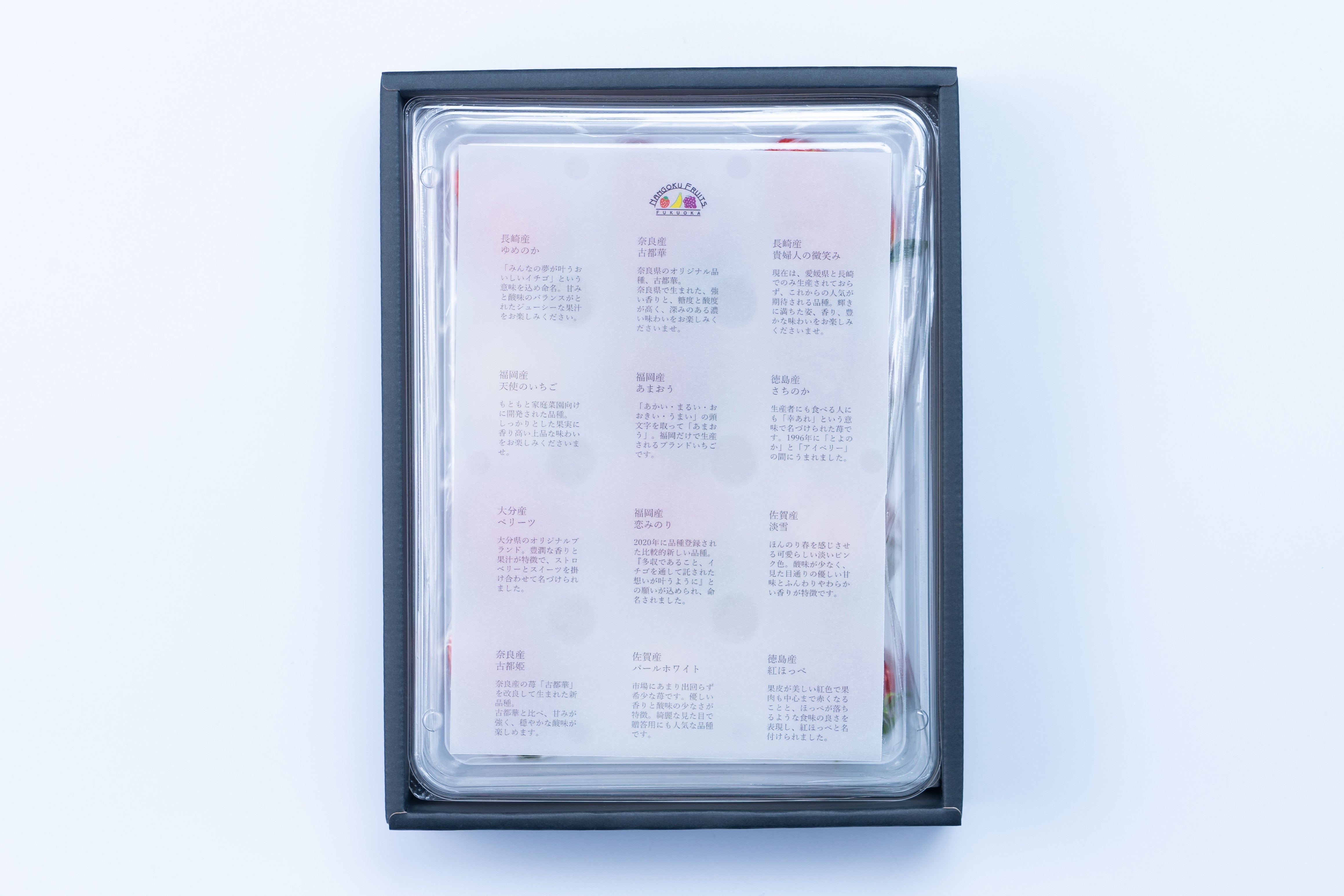 地元九州をメインに全国各地のいちごの中からそのときの仕入れに合わせて12品種詰め合わせます。
